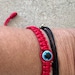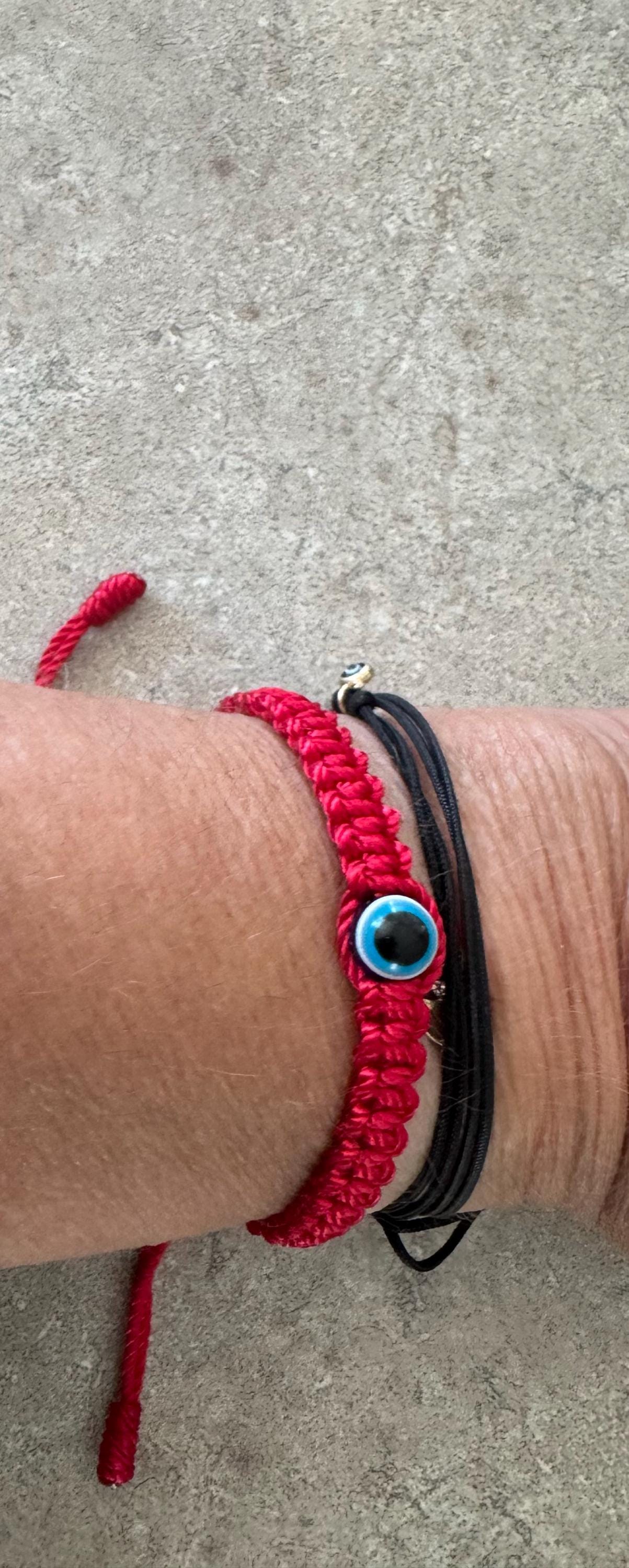 Adjustable red nylon bracelet with red or blue eye for protection or good luck.